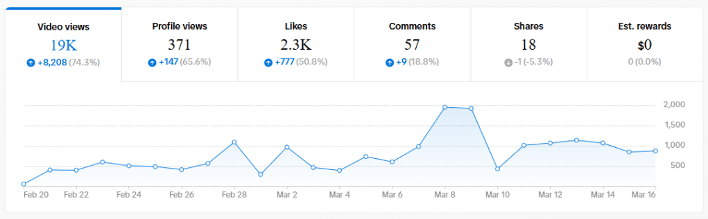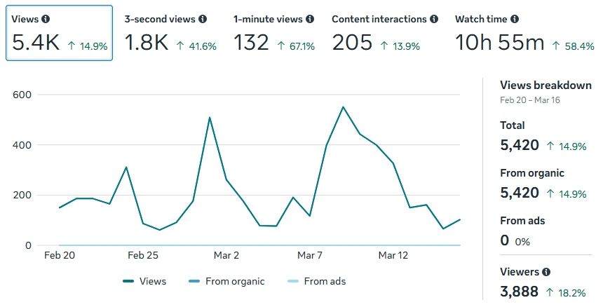 Video views have raised 74.3 percent to over 19,000 total, with profile views and likes experiencing a 65.6 and 50.8 percent increase respectively. While shares have experienced a negligible decrease, the increase in comments suggests that this content is starting to build community.
