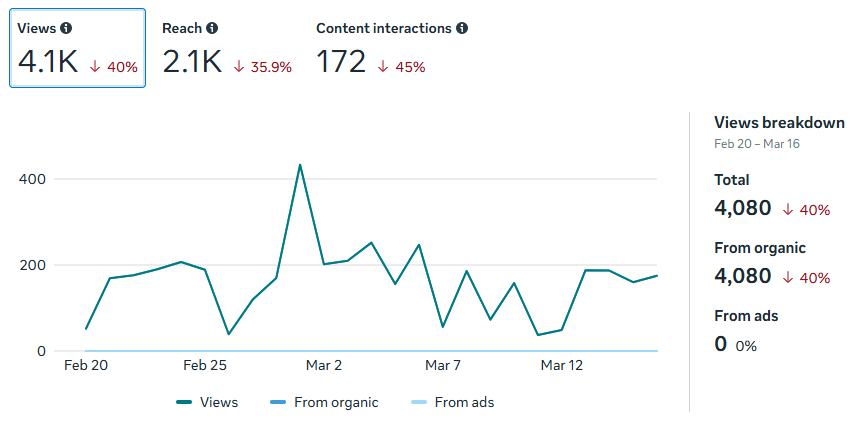 Here, we see that reactions have taken a dip while impressions has seen a slight increase. As expected, comments and reposts remain low as is typical for this kind of content on this platform.